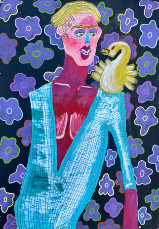 The artist's work centers around expressive paintings and works on paper that explores mental health, human interactions, and emotions. Life is depicted in a colorful and sarcastic way with ambiguity, addressing existential and political issues. Despite portraying violence and anger, the art is rendered in a comic and colorful manner to mitigate cruelty. Bright colors are used to paint dark subjects, symbolizing the search for light in challenging times.